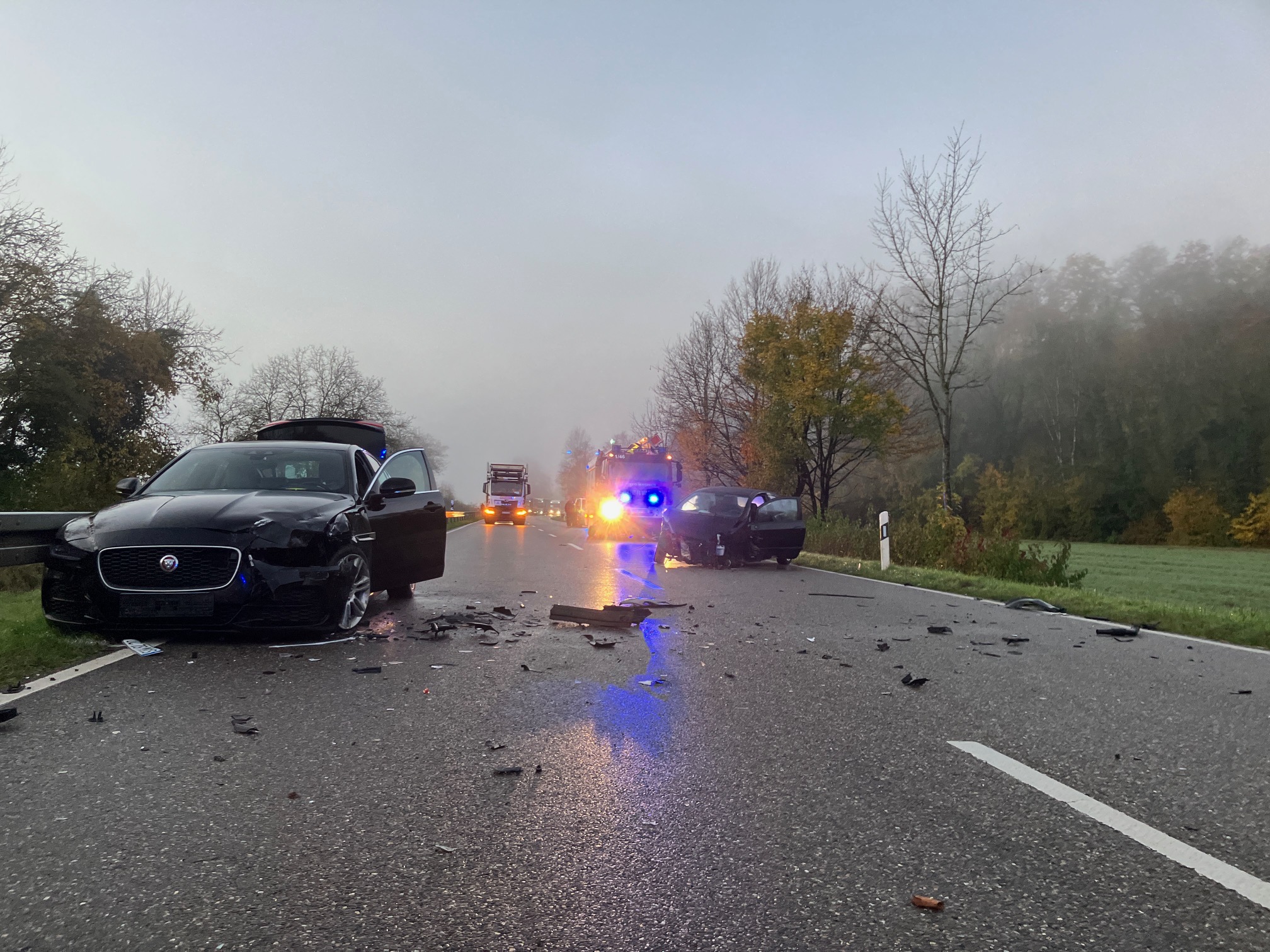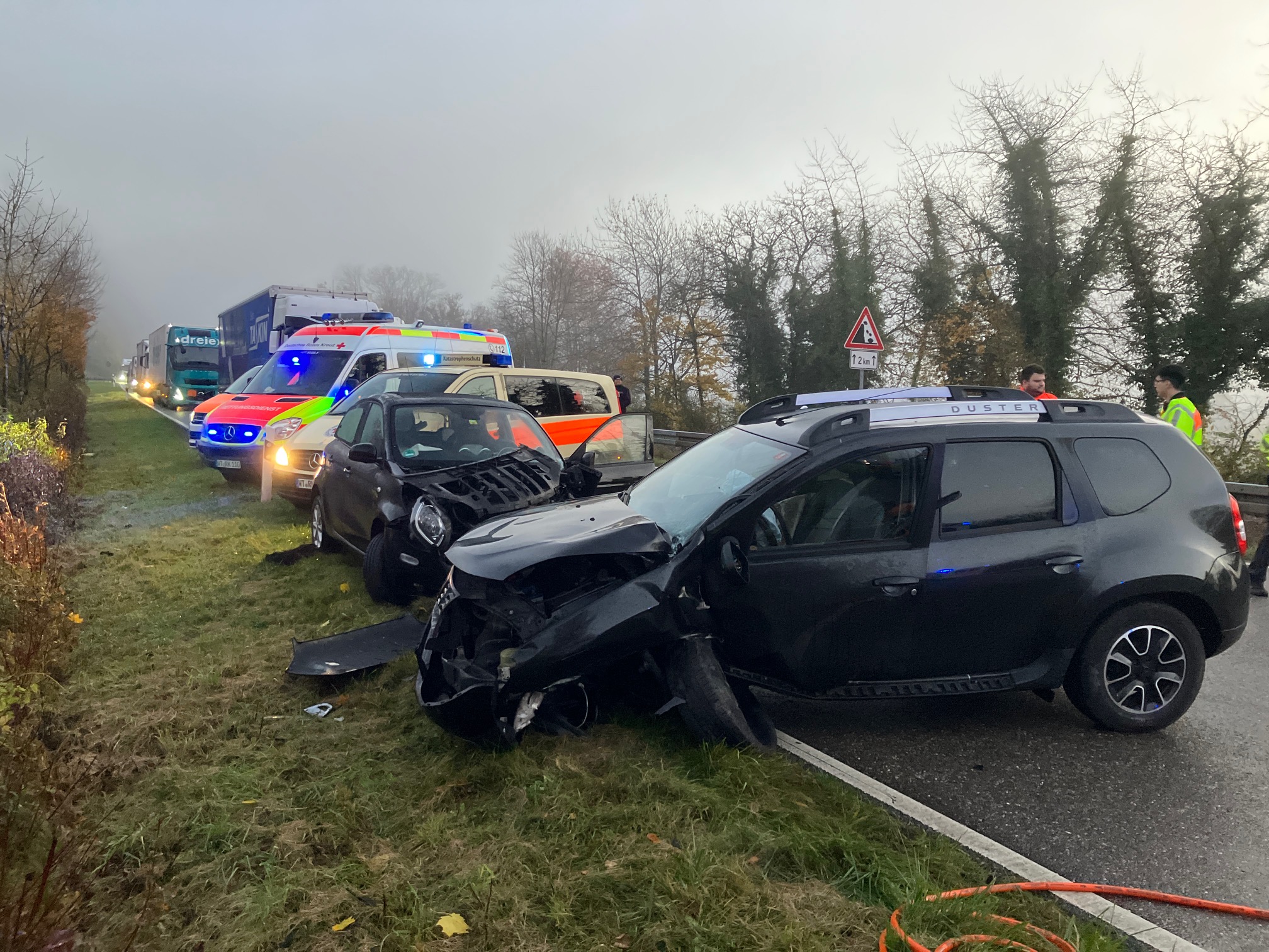 Am Montag, 03.11.2025, gegen 6:30 Uhr kam es zu einem schweren Verkehrsunfall auf der B 314 zwischen Horheim und Wutöschingen. Nach bisherigen Erkenntnissen geriet ein 20- jähriger Fiat-Fahrer aus noch unklarer Ursache auf die Gegenfahrbahn und kollidierte dort frontal mit einem Dacia. Dieser wurde durch den Zusammenstoß nach links abgewiesen und prallte gegen einen, dem Fiat in Richtung Waldshut folgenden, Smart. Beide Fahrzeuge waren nicht mehr fahrbereit und kamen auf der Fahrspur in Richtung Waldshut zum Stehen. Der Fiat stieß anschließend mit einem, hinter dem Dacia in Richtung Stühlingen fahrenden, Jaguar zusammen. An allen vier Autos dürfte wirtschaftlicher Totalschaden von insgesamt mindestens 30.000 Euro entstanden sein. Durch den Unfall wurden alle vier Fahrende verletzt und durch den Rettungsdienst in ein Krankenhaus eingeliefert. Die vier Autos mussten abgeschleppt werden. Die B314 war für knapp zwei Stunden gesperrt. Neben der Polizei und dem Rettungsdienst war auch die Freiwillige Feuerwehr vor Ort im Einsatz.