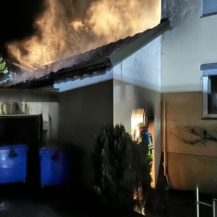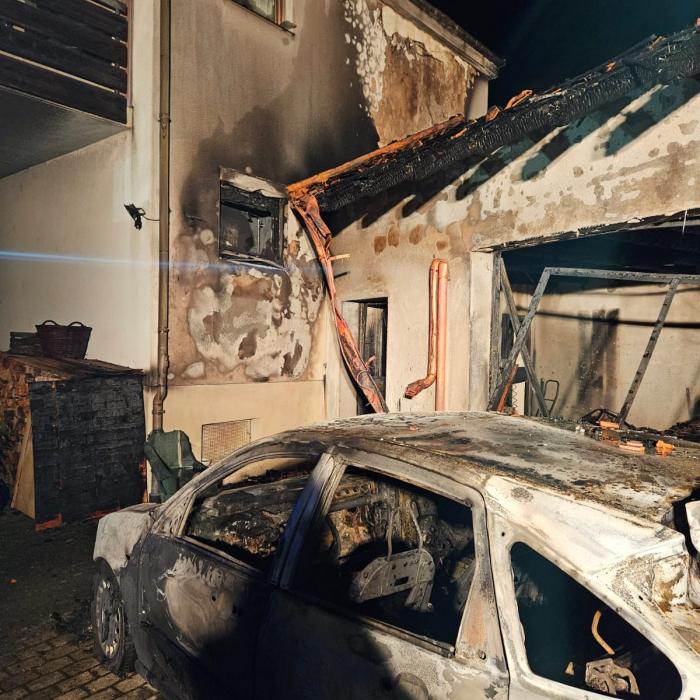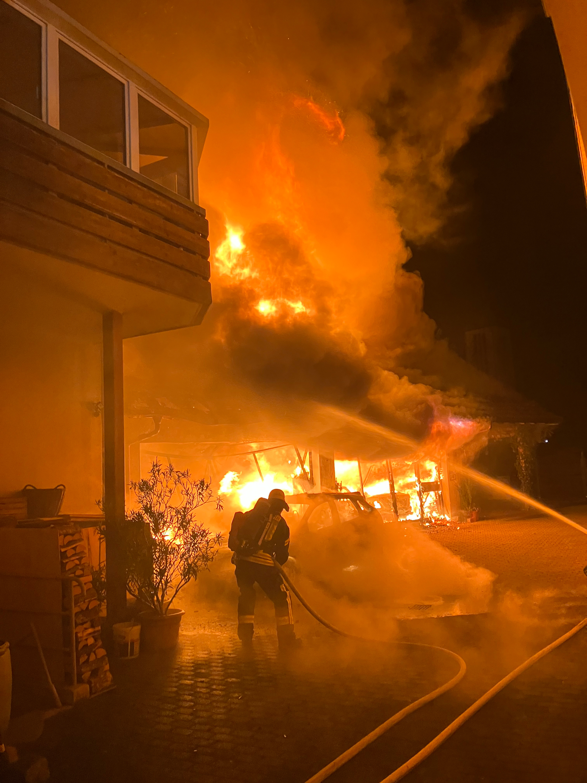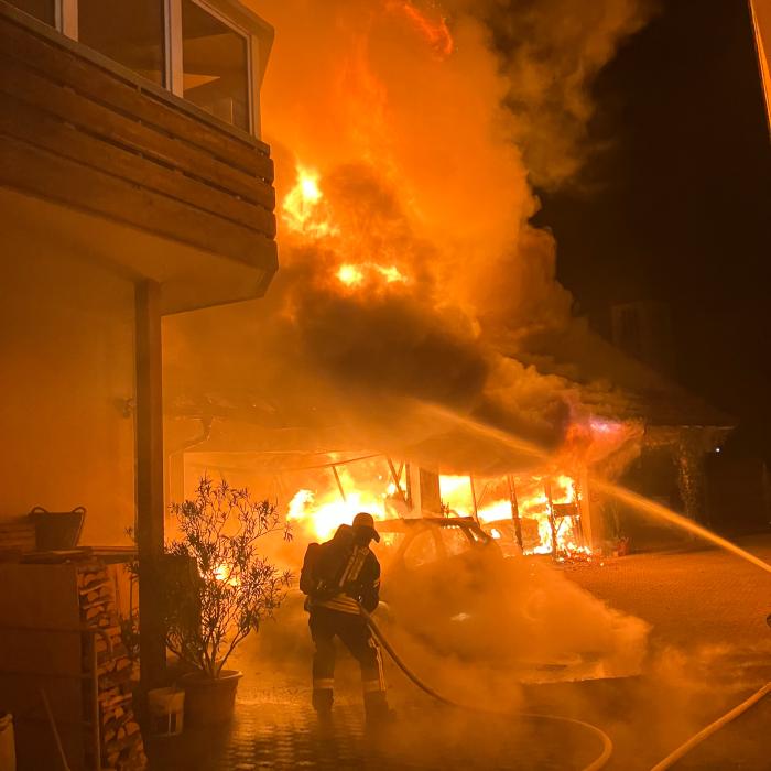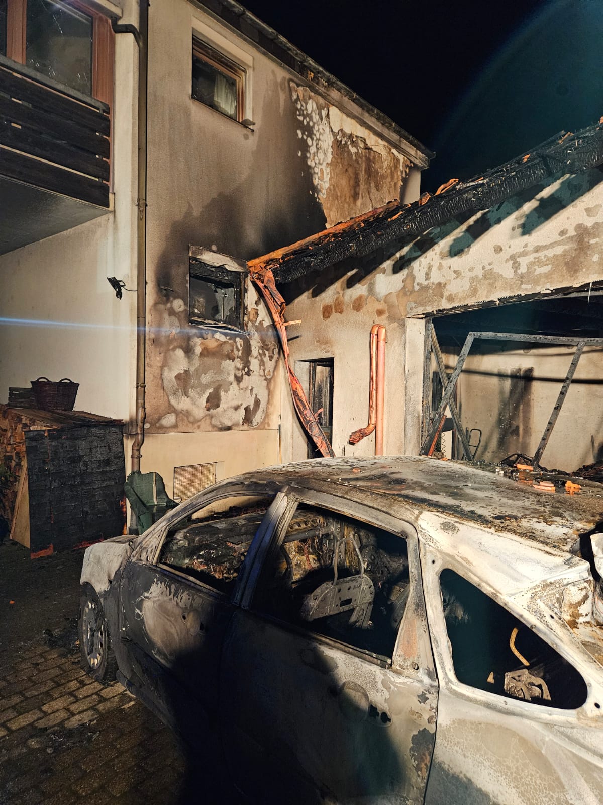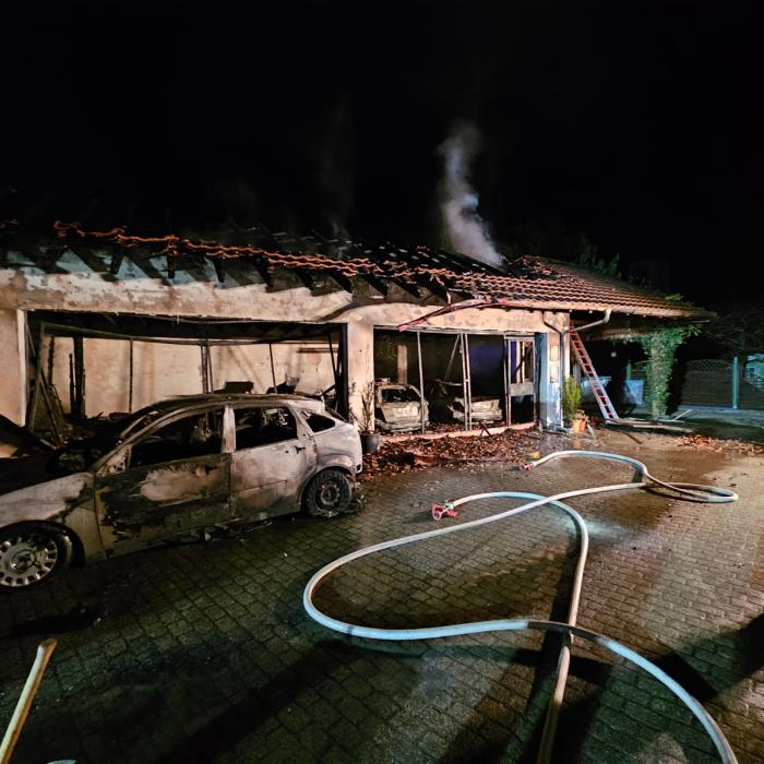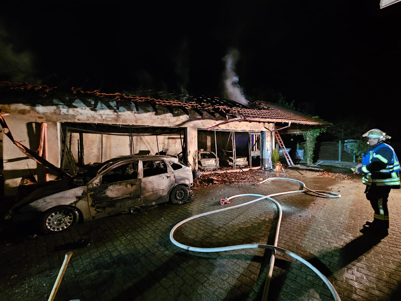 Eine größere Garage, mit mehreren PKWs, die an ein Wohnhaus angebaut war stand bei unserem Eintreffen bereits im Vollbrand.