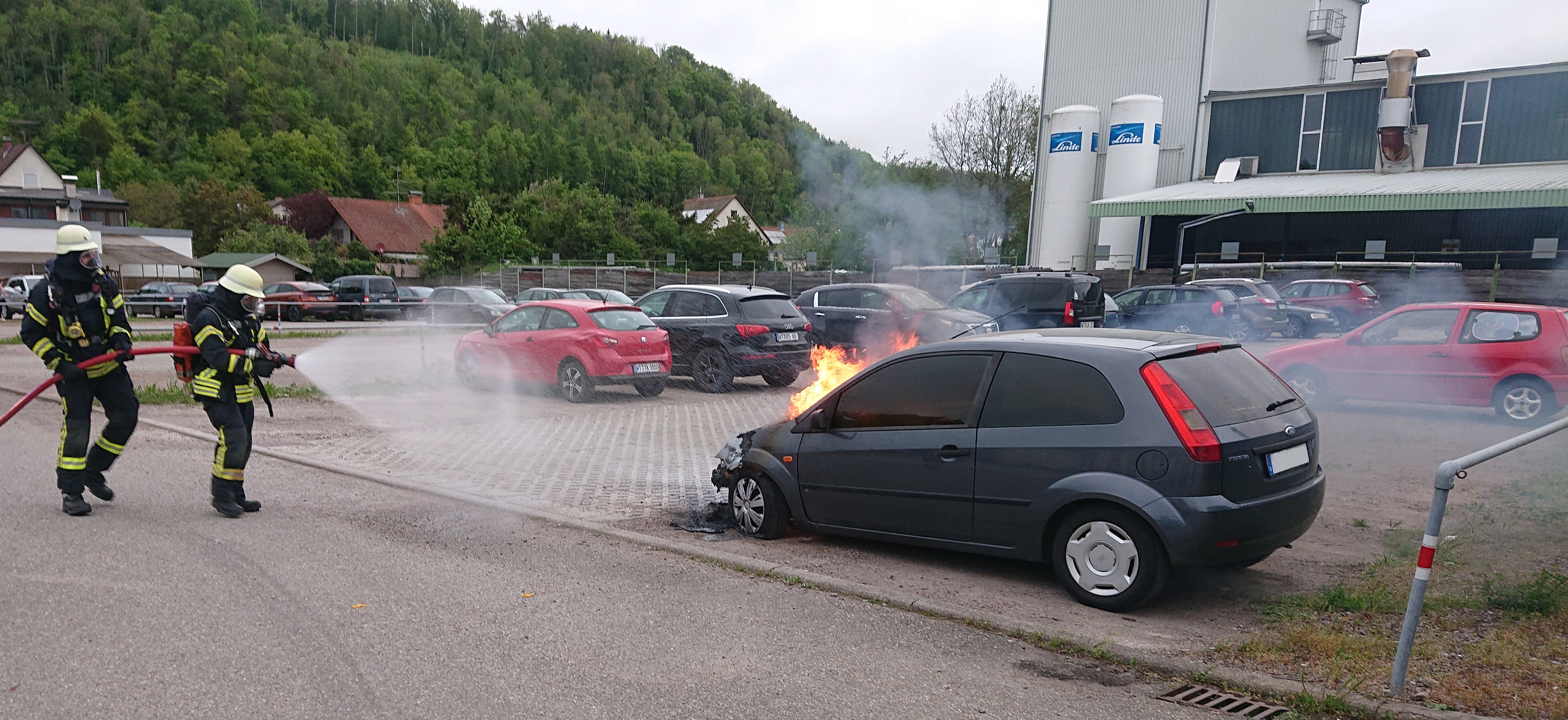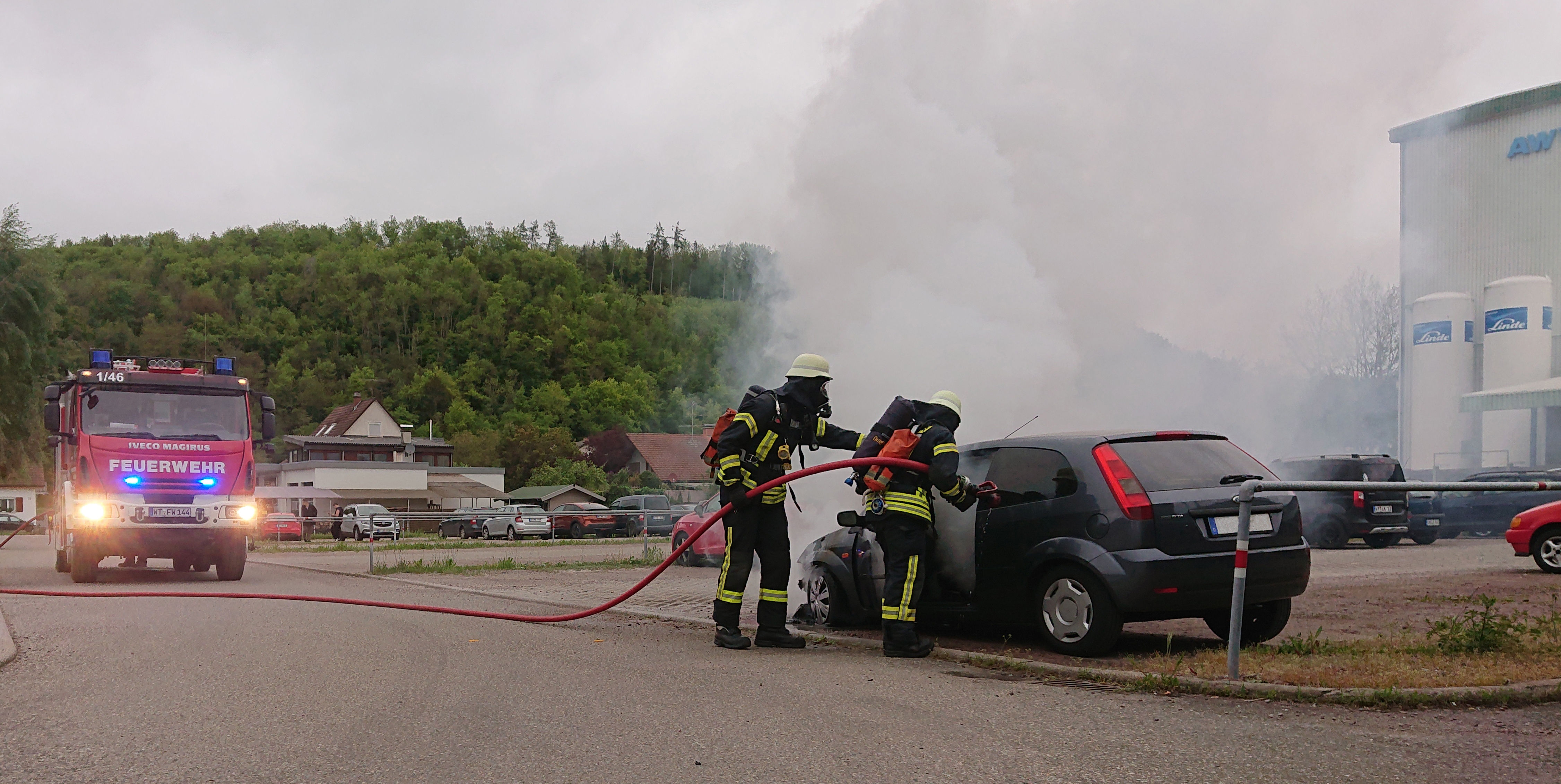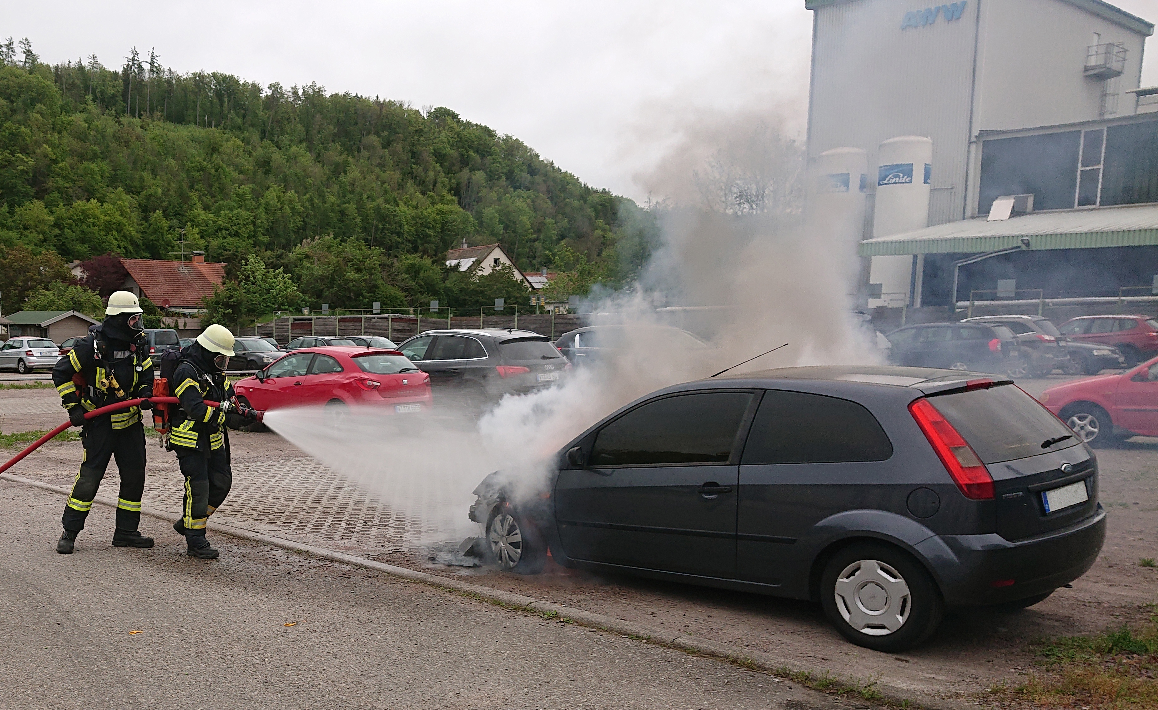 Am 02.05.2024 um 18:46 Uhr wurden wir zu einem PKW Brand auf dem Mitarbeiter Parkplatz der AWW alarmiert.